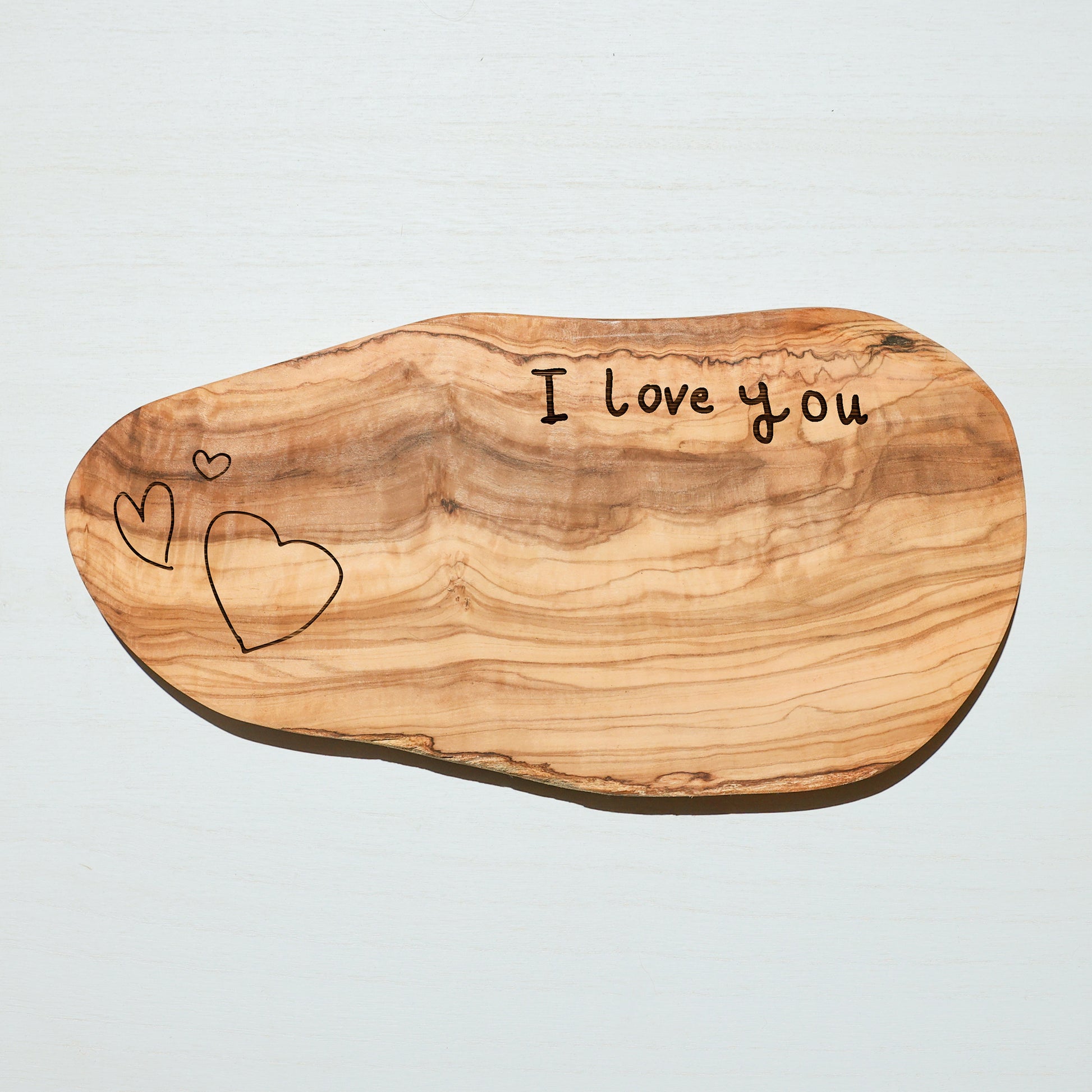 This beautiful olive wood cutting board measures approximately 12" long and are .75" thick. It's unique characteristics would be a lovely addition to any table! Personalize this board with a special message, monogram or date.
