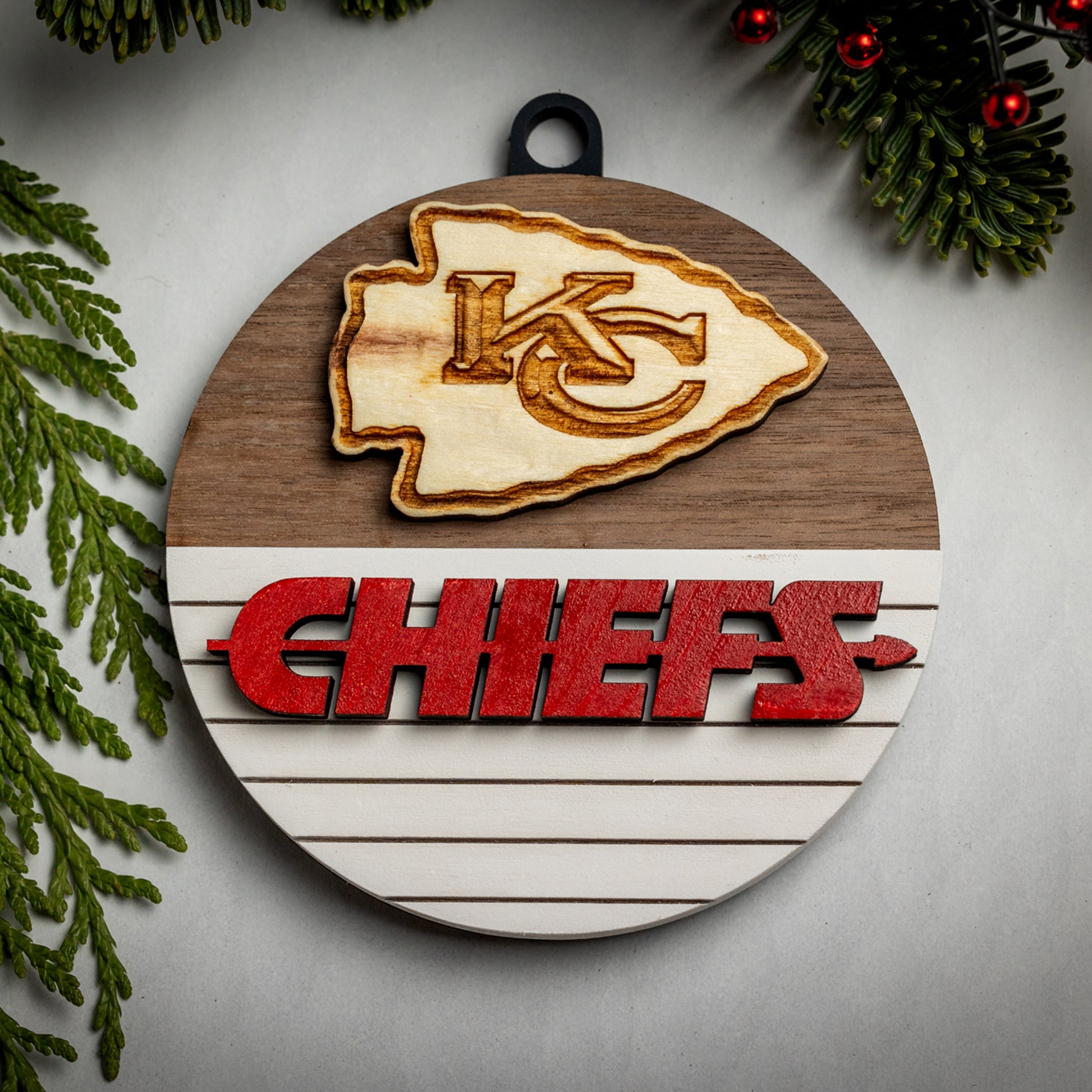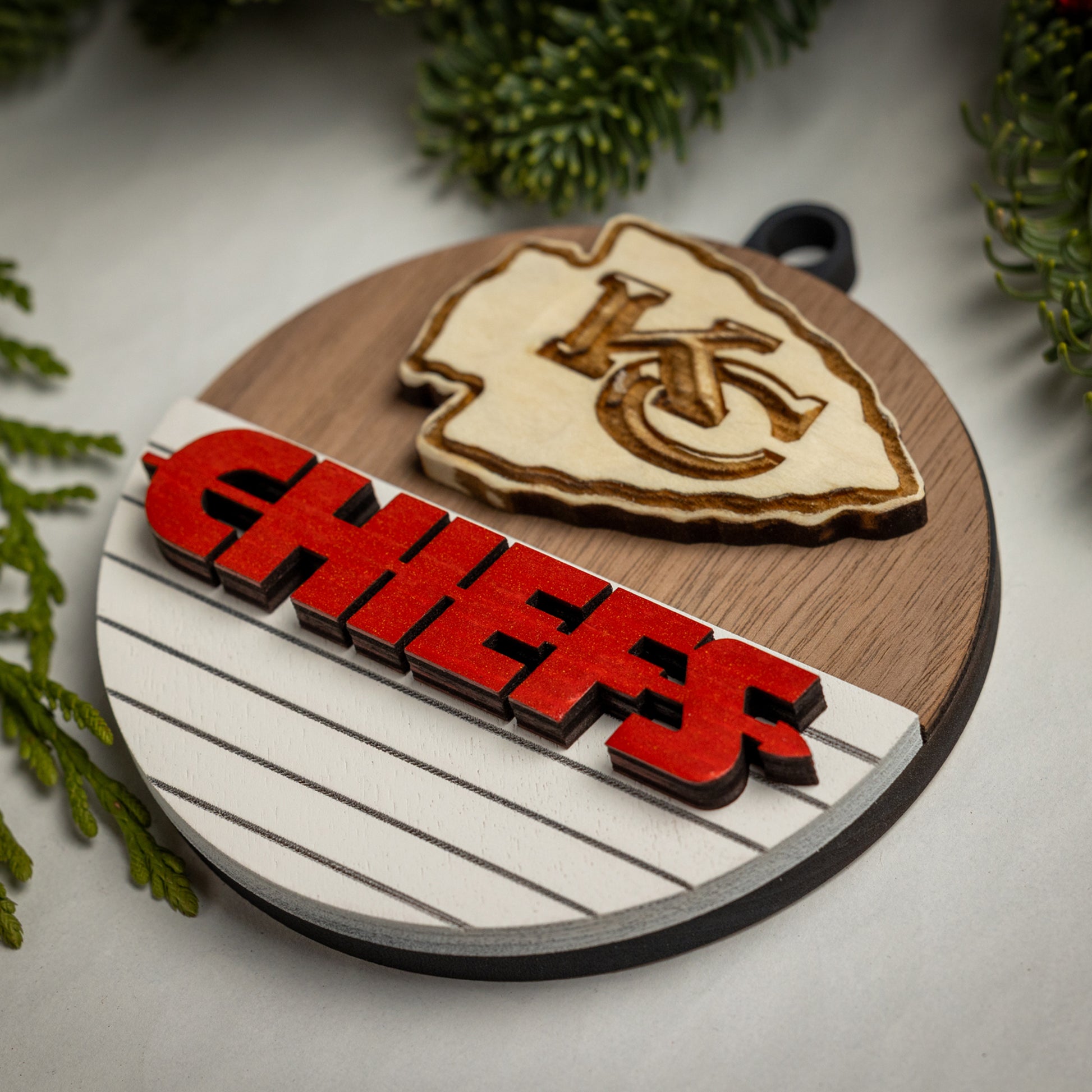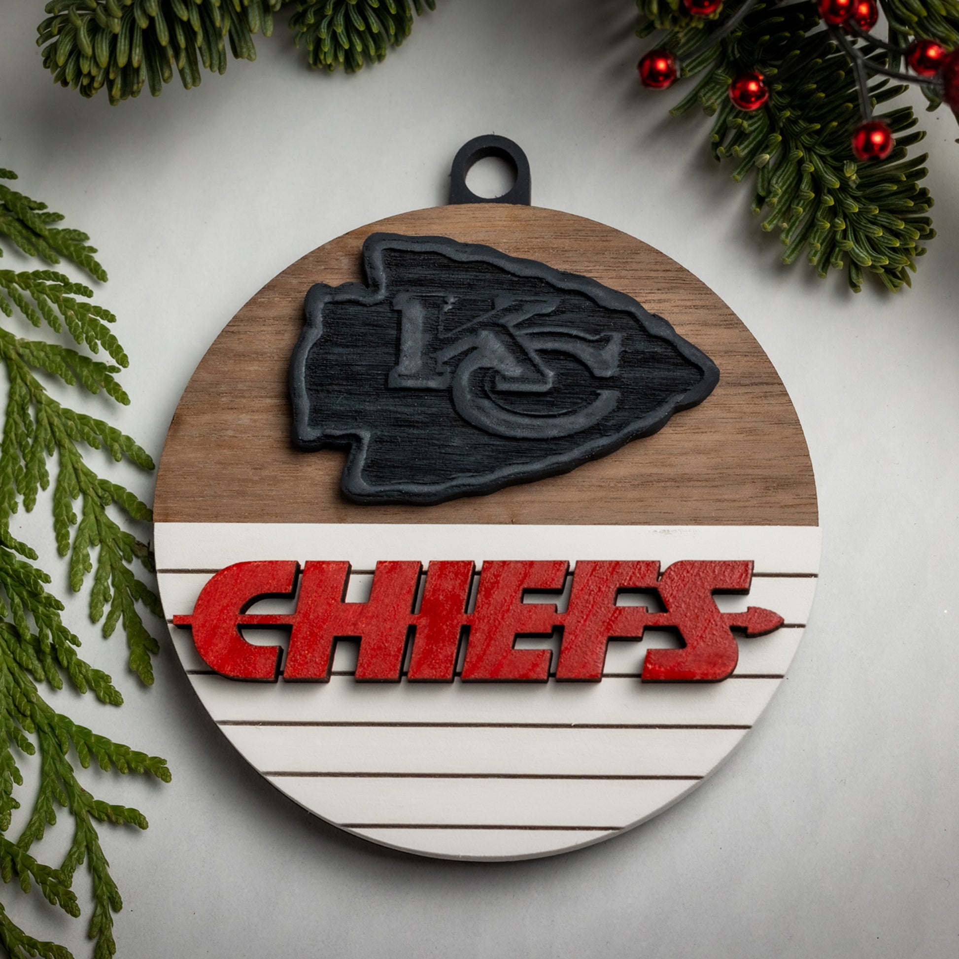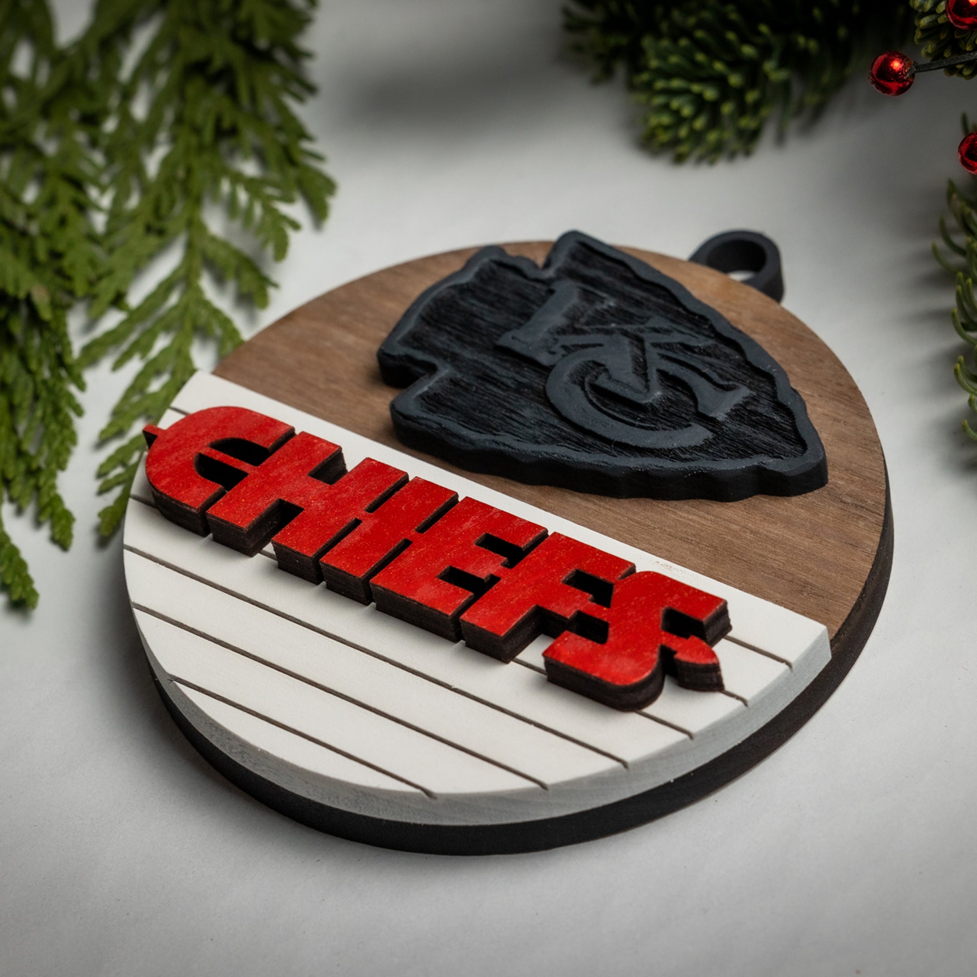Show your KC pride with our Chiefs Christmas ornaments! Each one features a hand-carved KC logo and bright red “CHIEFS” lettering, all crafted from solid wood. Choose from four different styles to find the perfect addition to your holiday decor.