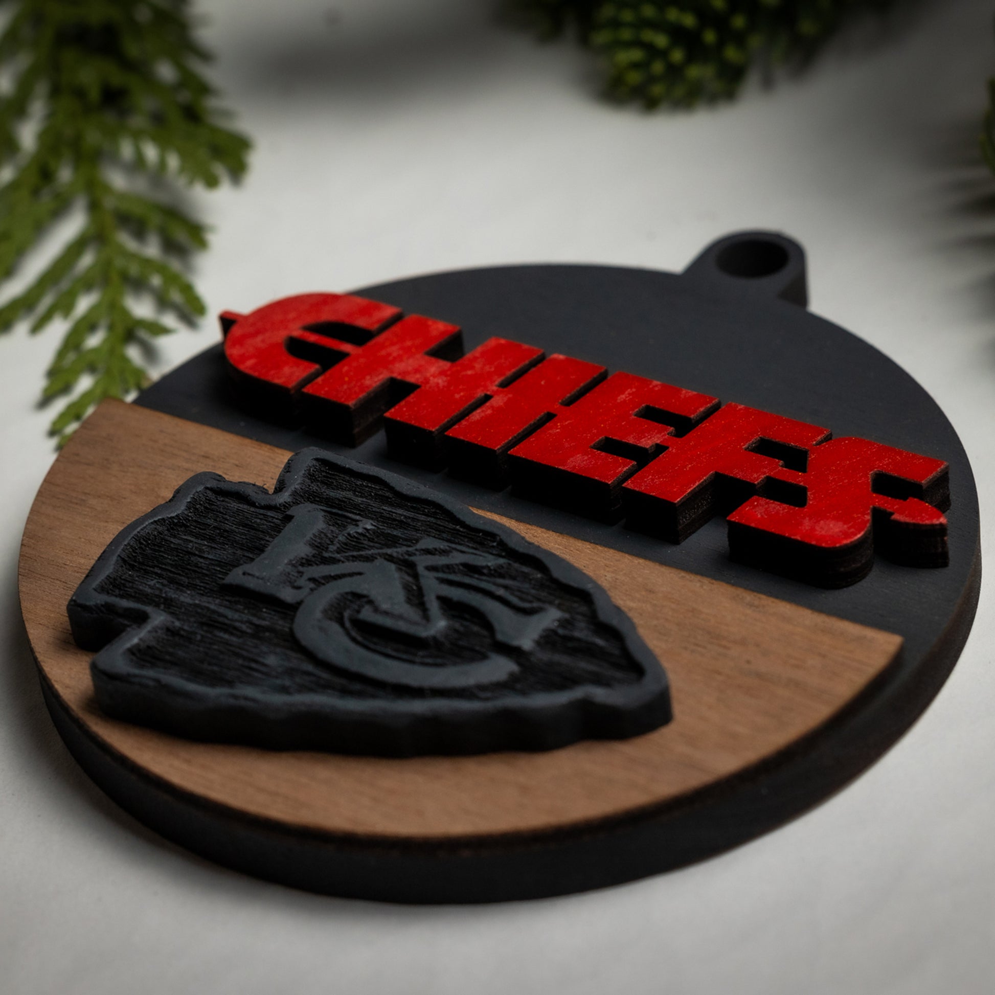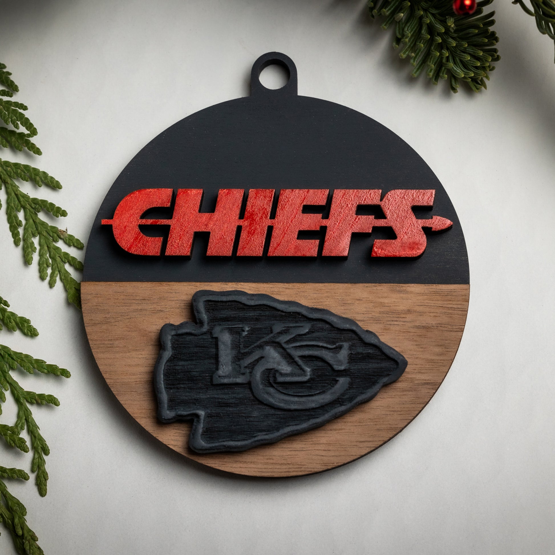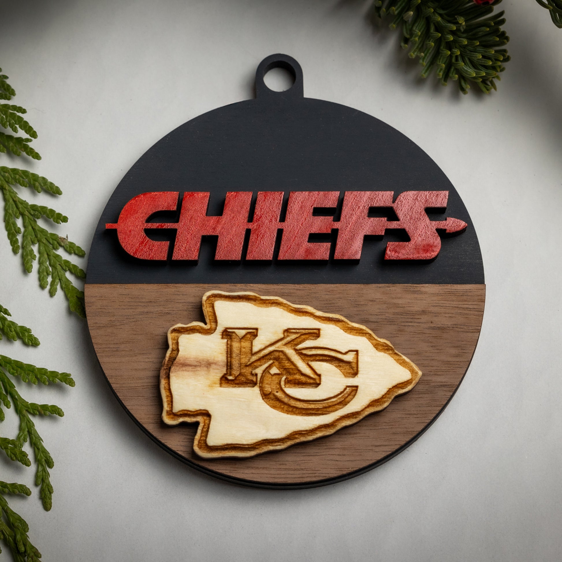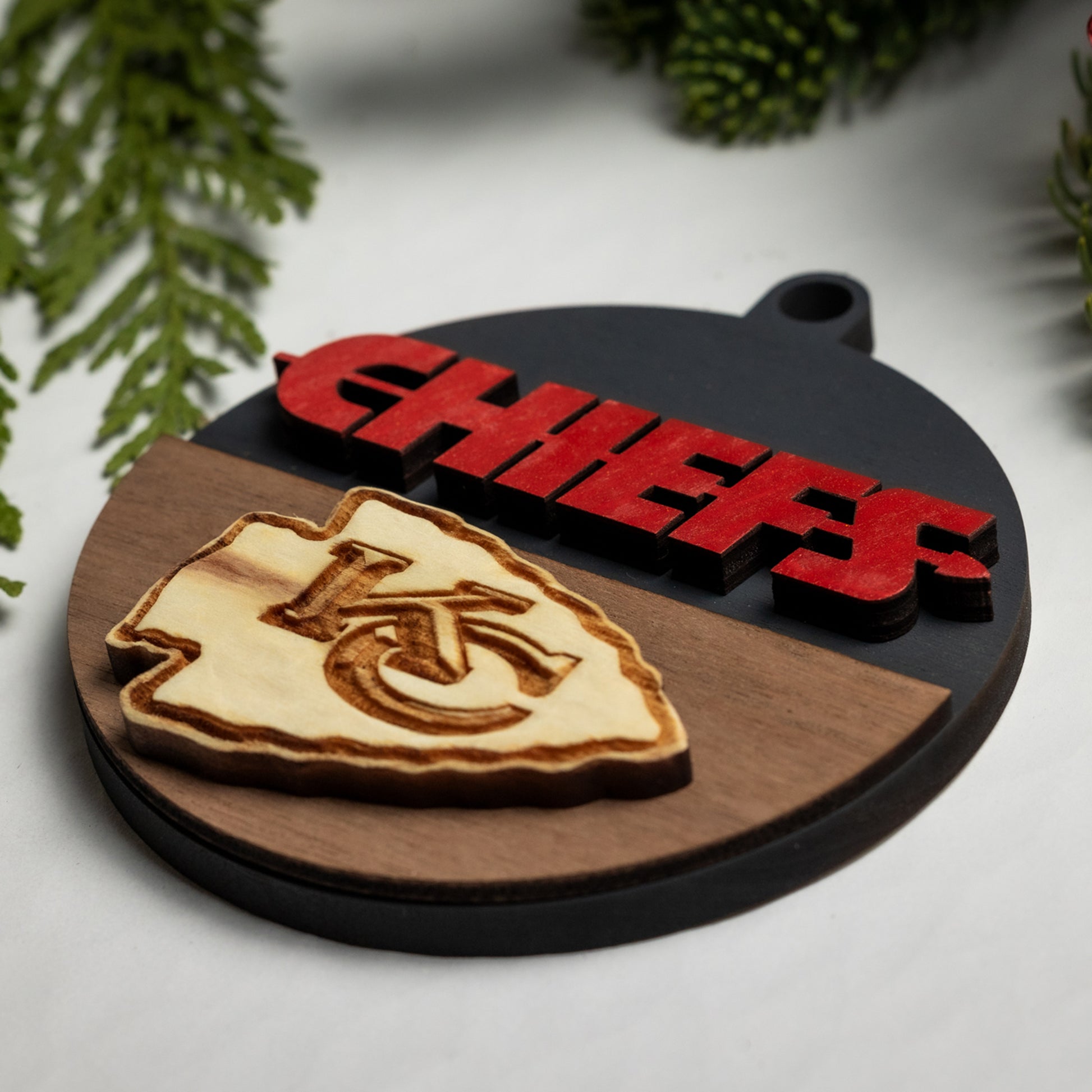 Show your KC pride with our Chiefs Christmas ornaments! Each one features a hand-carved KC logo and bright red “CHIEFS” lettering, all crafted from solid wood. Choose from four different styles to find the perfect addition to your holiday decor.